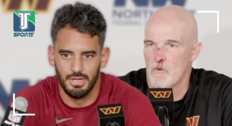 Marcus Mariota, Dan Quinn REACT to their sideline COLLISION that left the HC bleeding in Commanders’ WIN vs. Raiders | FULL POSTGAME Press Conference 🍵 If you are enjoying our